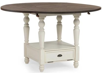 Gather ’round the Counter Height Drop Leaf Table from the Joanna Collection. This 59 inch round table is packed with features the entire family will love starting with a double-drop leaf top that expands to seat up to eight. At the heart of the table-top is a lazy Susan that makes serving dinner much easier! The turned leg counter base features a drop-down storage compartment for easy storage.